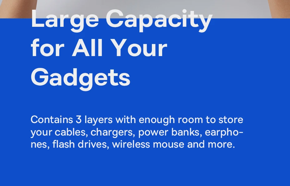 Contains 3 layers with enough room to store your cables, chargers, power banks, earphones,