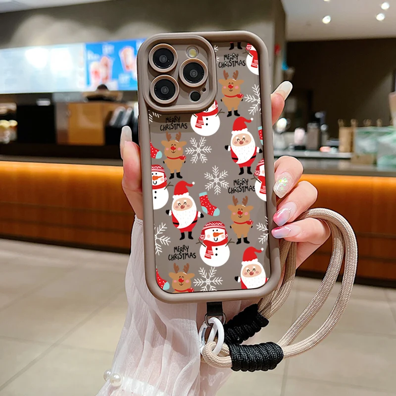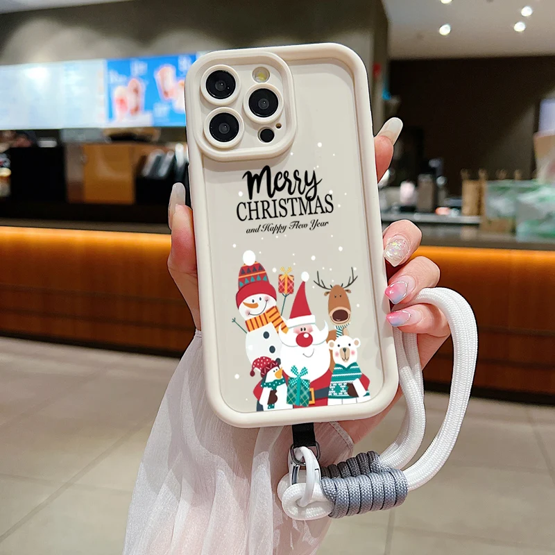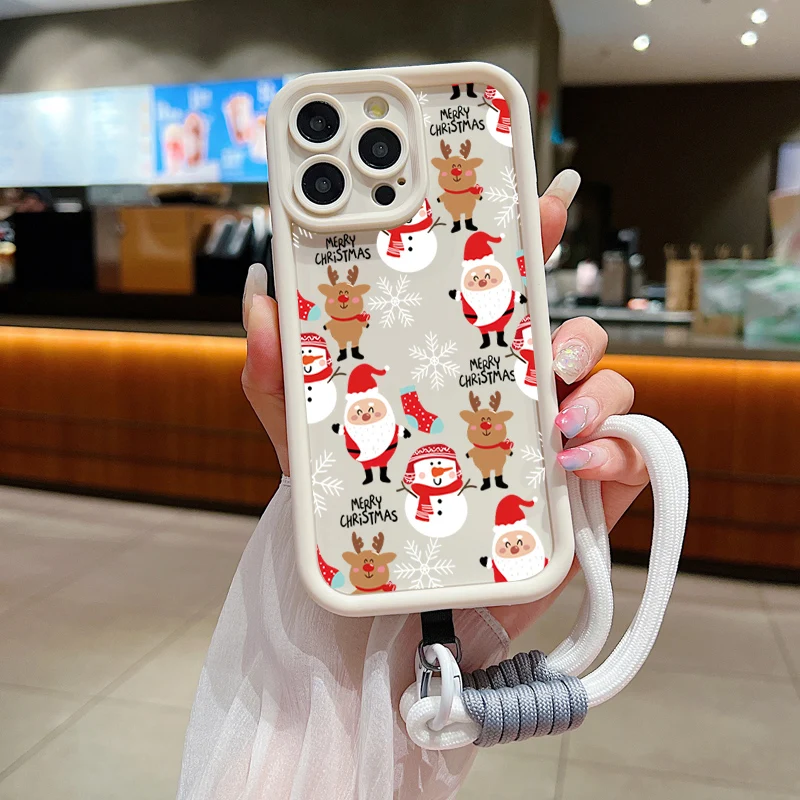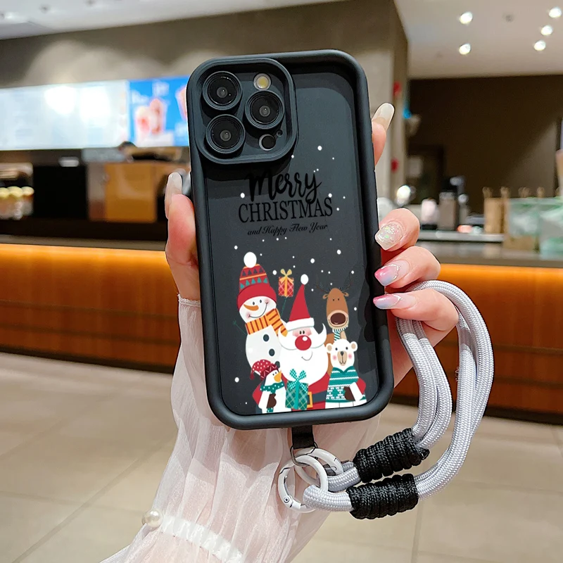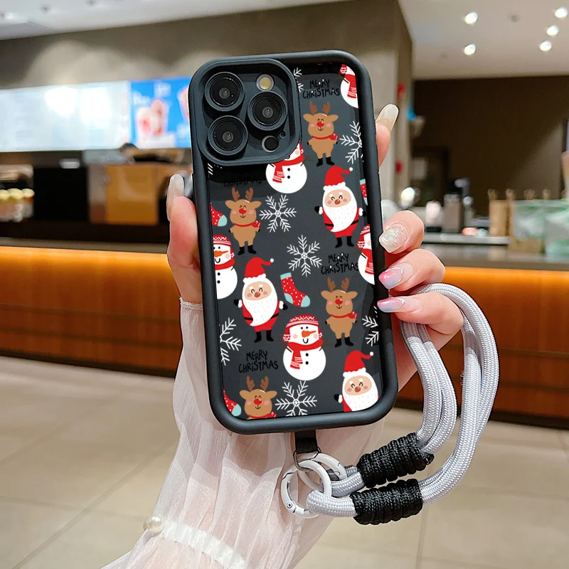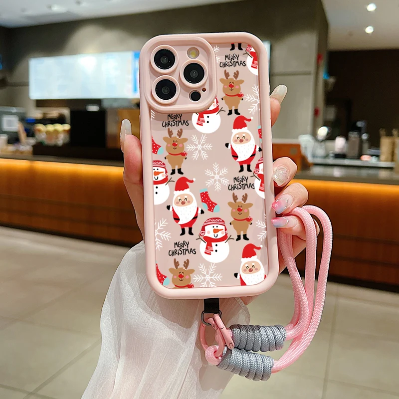 Christmas Pattern Lanyard Rope Phone Case For iPhone 16 15 14 13 12 11 Pro Max X XS XR 7 8 Plus Shockproof Soft Silicone Cover