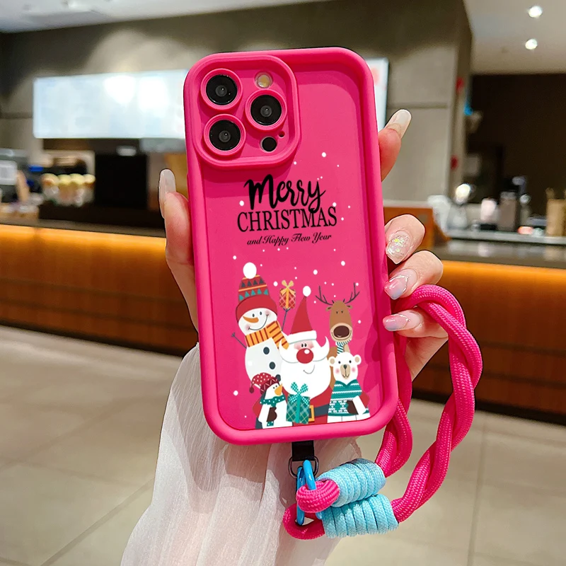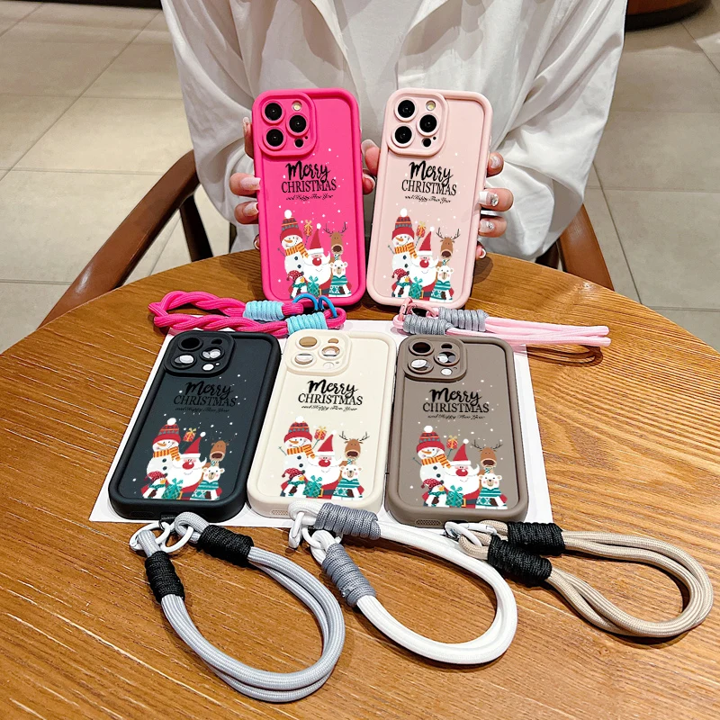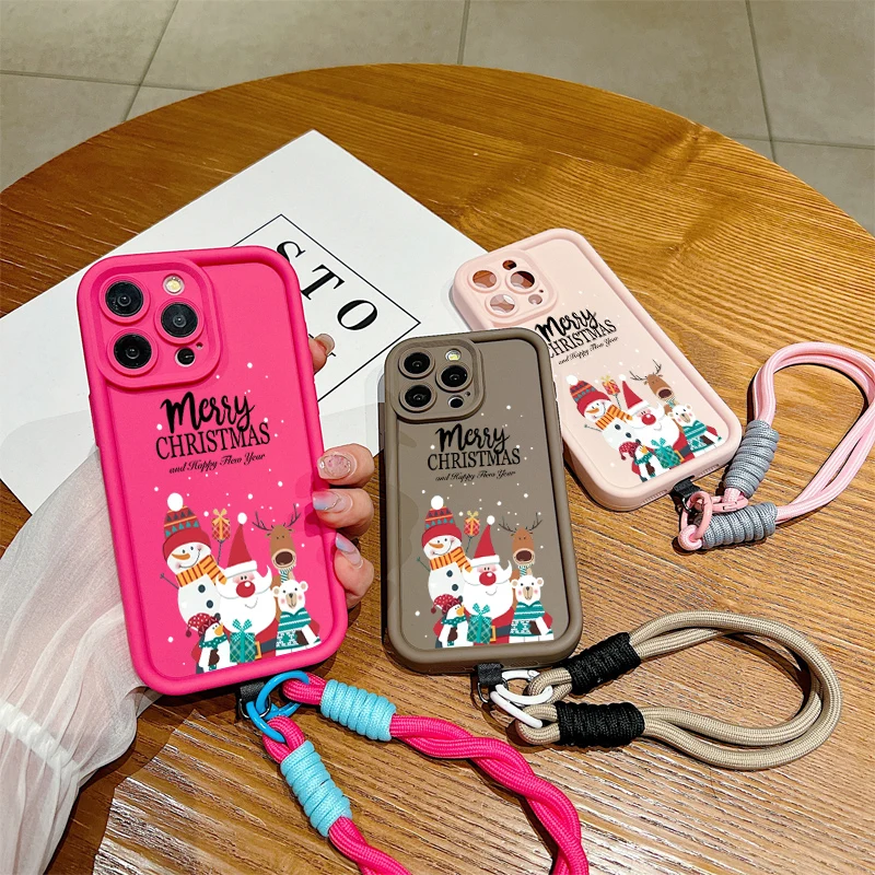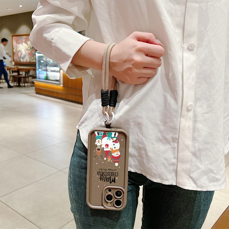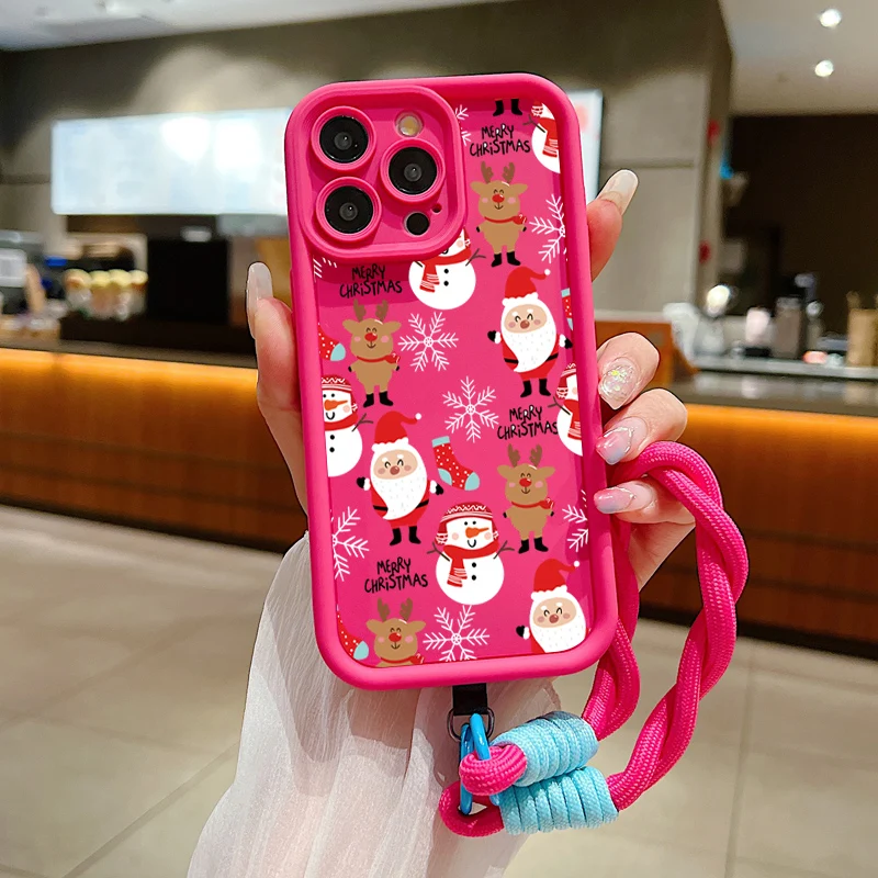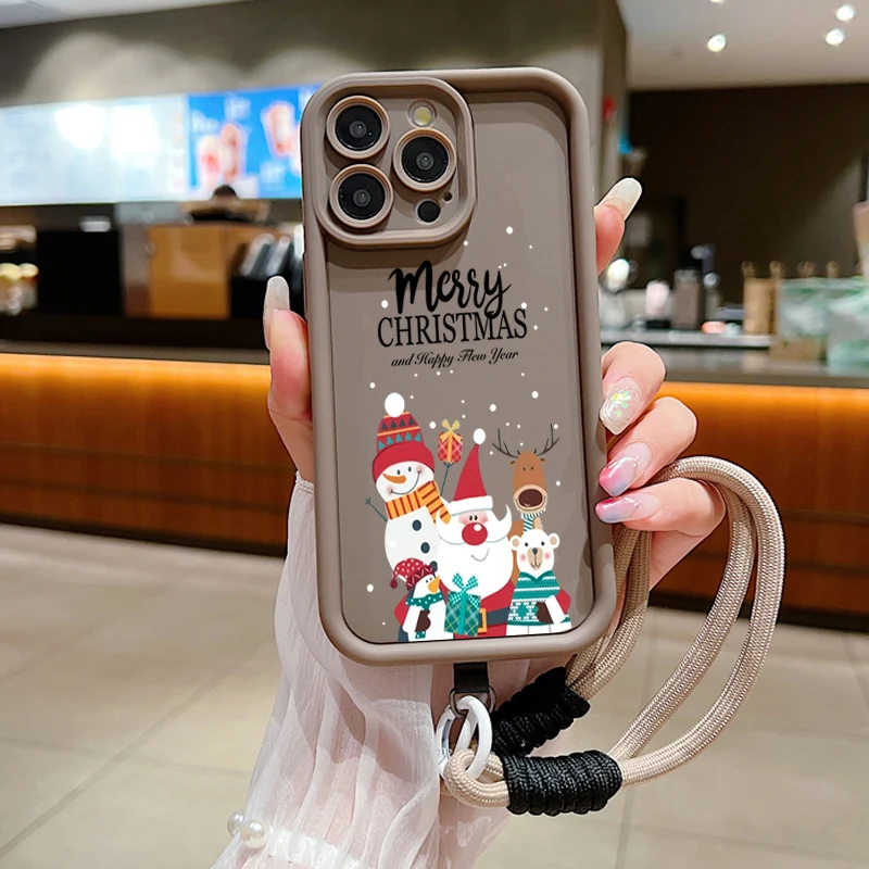 Christmas Pattern Lanyard Rope Phone Case For iPhone 16 15 14 13 12 11 Pro Max X XS XR 7 8 Plus Shockproof Soft Silicone Cover